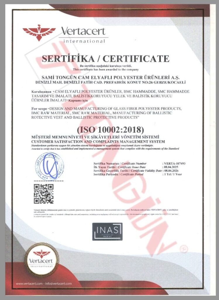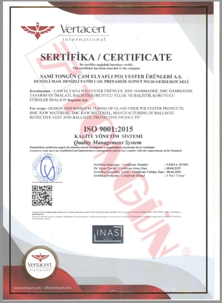 Üretim süreçlerimiz, TSE (Türk Standartları Enstitüsü) ve ISO 9001 Kalite Yönetim Sistemi başta olmak üzere ulusal ve uluslararası standartlara uygun şekilde dokümante edilmiş, belgelendirilmiş ve sürekli olarak iyileştirilmektedir.